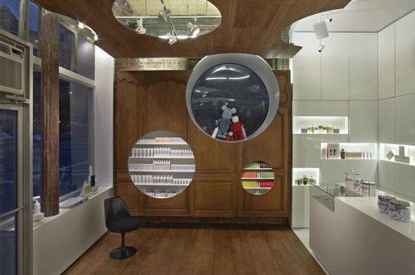 The Amsterdam Ave. shop is the second one that was opened by the (MALIN+GOETZ) family owned and operated apothecary affair that was launched in New York City in 2004. Making skin care easy to use, (MALIN+GOETZ) starts with sensitive skin resulting in a complete range of daily essentials complimented by problem-solution treatments to address each individual’s needs. All of these are sorted and arranged in an environment reminding of a blend between an old chemist's shop and a futuristic medical laboratory.